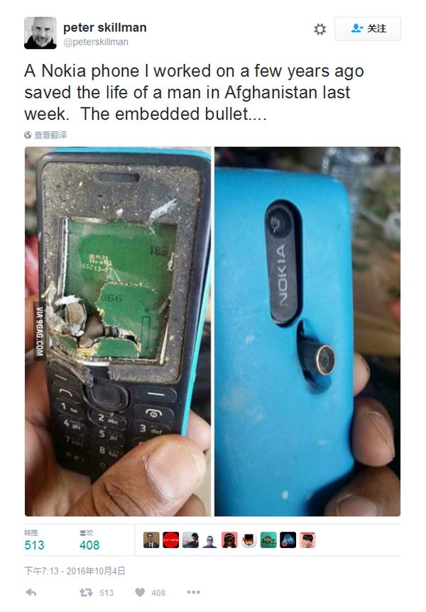诺基亚挡子弹早已经不是什么新鲜的事情了,近日它又成功挽救了一条鲜活的生命。微软总经理PeterSkillman在推文中写道“几年前我参与研发的诺基亚手机上周在阿富汗救了一名男子的生命”,在被微软收购之前,Skillman是诺基亚的设计经理。