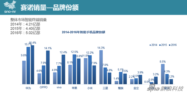通过对手机品牌用户的微博活跃度和品牌销量份额进行分析,会发现在微博上活跃的手机在品牌销量上表现往往突出,微博终端活跃度直接反映了手机品牌的市场表现。根据赛诺《2014-2016年智能手机品牌份额》数据显示,2016年度品牌份额排名前十的手机品牌与《2016年智能手机微报告》中“微博活跃设备品牌份额排榜”排名前十品牌吻合。