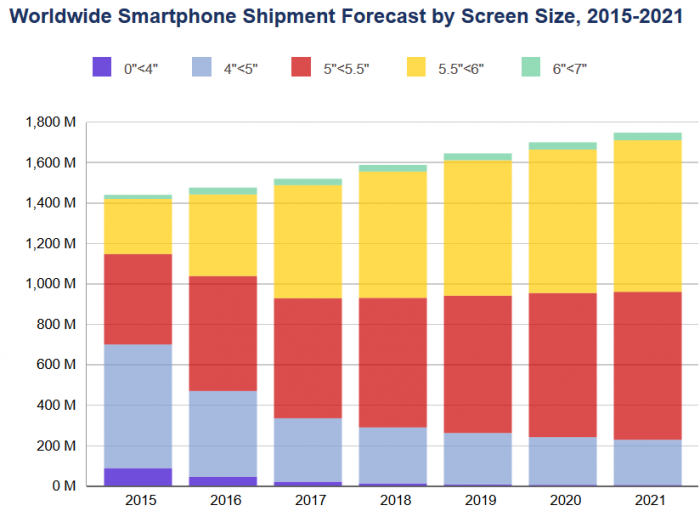 在未来几年时间内,智能手机制造商将都开始在显示屏上做文章,继三星和LG选择无边框屏幕之后,看起来苹果也打算这么做。等到2021年,5.5英寸和6英寸的智能手机将在市场占主体地位。