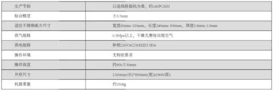 全自动高温胶贴合机是将高温胶与不锈钢载片自动贴合,滚压,切断,传送至下一工位的全自动化设备,设备采用三菱PLC系统控制,高温胶及不锈钢载片采用人工上料,设备可兼容不锈钢载片宽度在80mm-120mm,长度240mm-300mm,厚度0.8-1.0mm弹性不锈钢片。