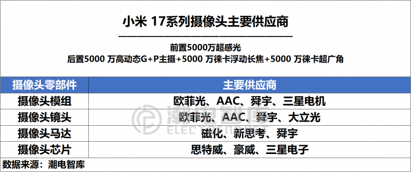 潮电智库从手机产业链处进一步了解,小米17系列摄像头模组主要供应商为欧菲光/舜宇//AAC;镜头主要供应商为欧菲光/AAC/舜宇/大立光;CMOS芯片主要供应商为思特威/豪威/三星;马达主要供应商为磁化/新思考/舜宇/