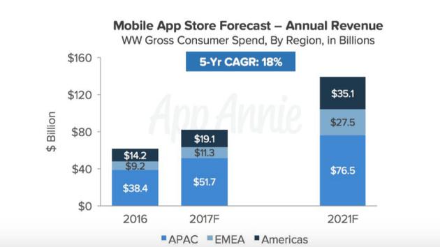 这份报告认为,未来几年的增长主要受益于实体交易向移动交易的转变。App Annie强调称,阿里巴巴最近宣布其中国零售市场2017财年有79%的交易额都是通过移动平台创造的,高于上一财年的65%。
