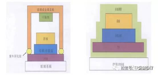 图7:以玻璃为衬底和以玻璃或金属盖板封装的OLED硬屏(左)与以柔性聚合物材料为基板和以单层或多层薄膜材料封装的OLED柔屏(右)结构图