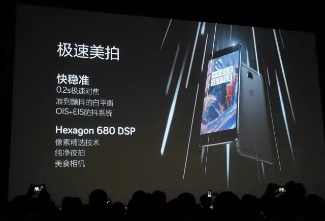 据刘作虎介绍,一加3的相机具备快、准、稳三大特点:0.2秒PDAF相位对焦,0.9秒息屏极速启动,OIS光学防抖+EIS电子防抖,Hexagon 680 DSP+6GB大内存+一加专利“像素精选”处理技术。一加3支持多种滤镜,在暗光拍照、夜拍、美食等多种场景下都有较好的表现。