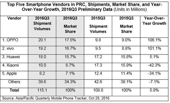 在2016年三季度中国手机市场中,苹果风光早已不再,IHS的数据显示,iPhone的市场份额为9%,只有第一名OPPO的一半,我们知道iPhone 7/7 Plus在9月16日上市,其时间点已经接近第三季度尾声,或许在下个季度结束时,我们能看到新机的上市对苹果带来的真正影响。