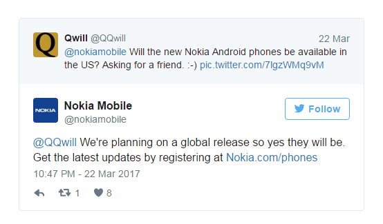 HMD当时并没有公布任何具体的计划。不过现在HMD现在已经在推特上确认,其设备确实将在美国确实上市。至于其“全球”发售计划,该公司尚未提供完整的国家清单。在一份发给NPU的声明中,HMD表示,该公司“有在2017年第二季度同时在120个市场上发售诺基亚3/5/6的雄心勃勃的计划”。另据一位英国零售商最近透露,诺基亚Android智能手机预计将于5月份上市。
