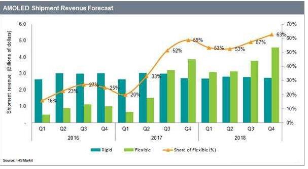 IHS Markit表示,随着柔性AMOLED显示屏的需求继续大幅增加,预计其全球面板营收在2017年第三季度将达到32亿美元,超过刚性AMOLED面板的营收(30亿美元)。