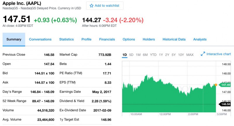 苹果周二在纳斯达克交易所的开盘价为147.54美元。截至周二收盘,苹果股价上涨0.93美元,报收于147.51美元,涨幅为0.63%。截至美国东部时间周二18:06分(北京时间周三6:06分),苹果股价在盘后交易中下跌3.24美元至144.27美元,跌幅为2.20%。过去52周,苹果股价最高为148.09美元,最低为146.84美元。(编译/箫雨)