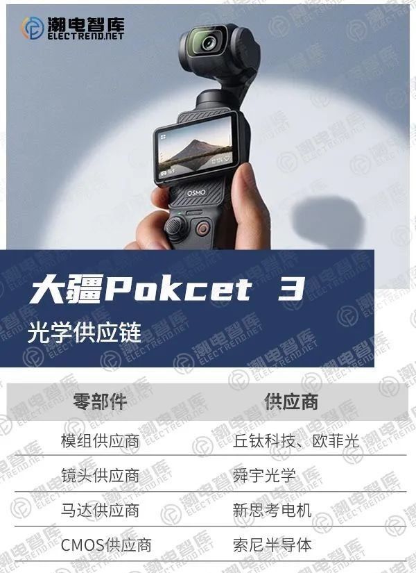 潮电智库从光学产业了解到,大疆Osmo Pocket 3的模组供应商分别为丘钛科技、欧菲光;镜头供应商为舜宇光学;马达供应商为新思考电机;CMOS供应商则是索尼半导体,月计划交付在800K-1KK。