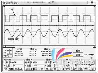 触摸信号的频率是由触摸笔发出,触摸笔上有两个按键,按下这两个按键可以输出两个不同频率的信号,分别为k1、k2。触摸笔的作用相当于鼠标,当触摸笔输出一次k1频率时相当于点击一下鼠标左键,输出一次k2频率相当于点击鼠标右键。当触摸笔笔尖与LCD距离≤3~5 cm时,触摸检测装置可感应到触摸信号,这时光标随着触摸笔在LCD上移动。触摸信号频率检测精度的高低是触摸屏是否稳定的关键因素。频率检测电路及仿真结果如图5、图6所示,TOUCH_SIN端为触摸信号输入端,通过施密特触发器,然后信号从FRE端发送到单片机,进行运算处理,计算出触摸信号的频率。利用Multisim软件平台建立出频率检测电路仿真模型,从仿真结果中可以看到,经过处理后的触摸信号转换为具有相同周期T的方波信号,将方波信号传送到微处理器,微处理器在t时间里计算出方波的个数n,则信号的周期T=t/n,频率f=1/T,由此确定触摸信号的频率。